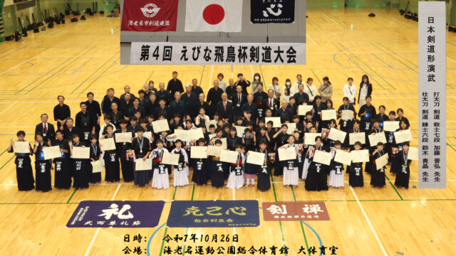 令和7年7月26日(土)海老名市剣道連盟のビッグイベントの一つである 表題の剣道大会が開催され、ショット写真を掲示いたします。 ご来賓として内野 優 海老名市長、戸沢 幸雄 海老名市議会議長、倉橋 正美 海老名市スポーツ協会会長にご臨席いただきお言葉を頂きました。 今回は演武として、基本錬成(未就学児等初心者)、木刀による剣道基本稽古法(小学生各支部代表)、 日本剣道形演武(打太刀:六段 小幡 和也先生、仕太刀:六段 山崎 富枝先生) 居合道演武 湘志会武道塾 教士八段 古市 典雄 先生